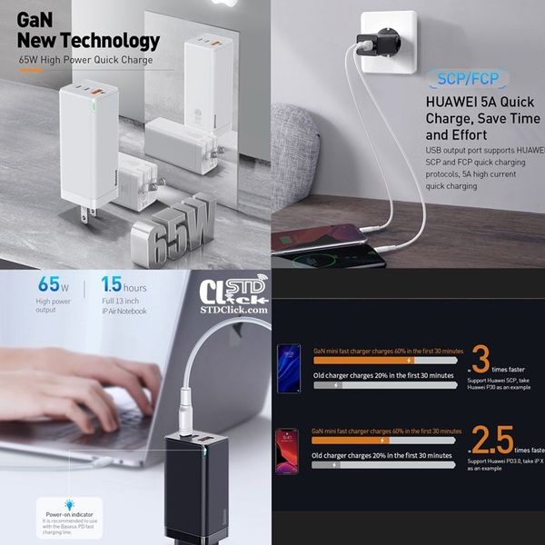 Ví dụ, củ sạc GaN mới của Baseus cải thiện hiệu quả điện năng đến 40%. Có các loại sạc công suất 30W, 60W, và 65W dành cho laptop smartphone , table