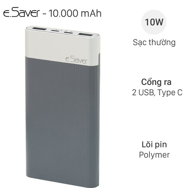 eSaver PJ JP188 sở hữu dung lượng pin khá lớn là 10.000 mAh và được trang bị tới 2 cổng ra 5V - 2A giúp bạn giảm được thời gian khi sạc nhiều thiết bị cùng một lúc. Chiếc sạc dự phòng này còn được trang bị dải đèn LED giúp bạn dễ dàng kiểm soát dung lượng pin còn lại để chủ động hơn trong việc sạc đầy nữa đó.