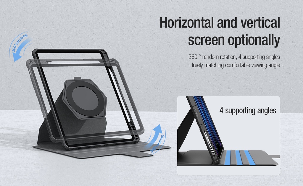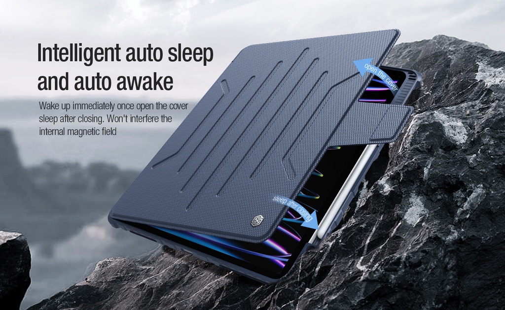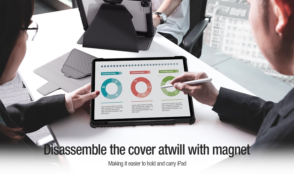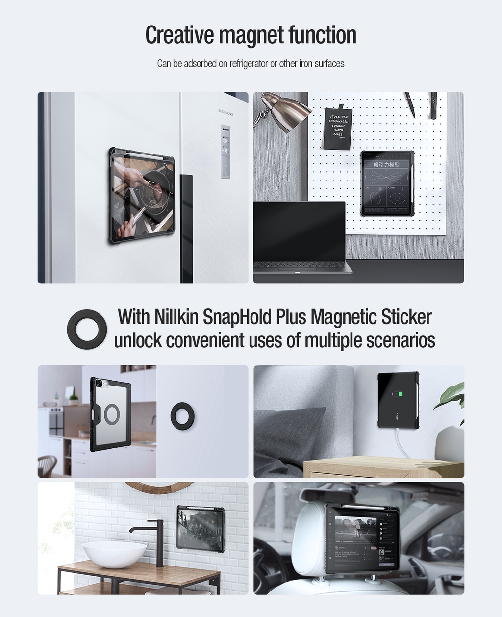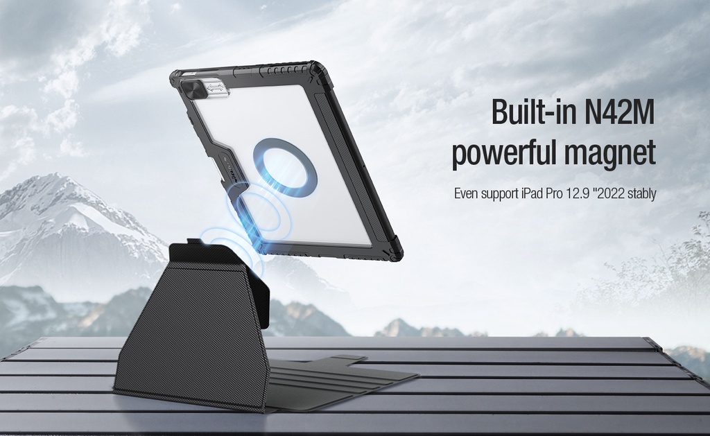 BAO DA IPAD PRO M2 12.9 2022 - M1 12.9 2021 - 12.9 2020 NILLKIN BUMPER SNAPSAFE NAM CHÂM HÍT ĐA NĂNG CHÍNH HÃNG với phần Nắp có thể tháo rời thông qua nam châm hút cực mạnh, vòng nam châm mặt lưng còn có thể được hít chắc chắn trên bề mặt sắt. Với thiết kế vòng nam châm và nắp tự hít có thể tháo rời giúp máy có thể đặt theo chiều ngang và chiều dọc, góc nhìn có thể được điều chỉnh tự do ở mọi góc 360 °