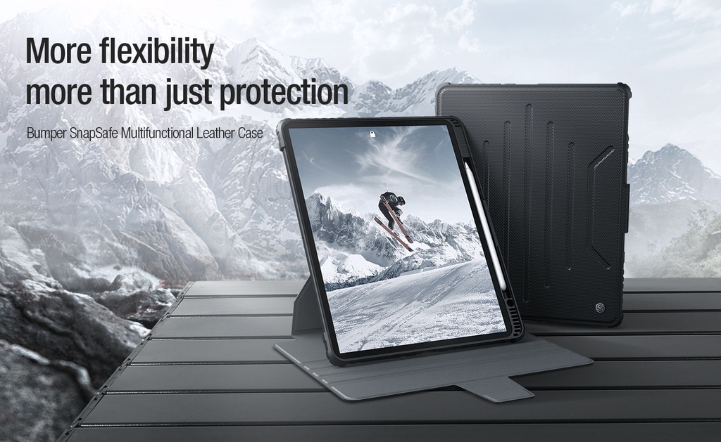 BAO DA IPAD PRO M2 12.9 2022 - M1 12.9 2021 - 12.9 2020 NILLKIN BUMPER SNAPSAFE NAM CHÂM HÍT ĐA NĂNG CHÍNH HÃNG chống sốc rất tốt, có bảo vệ camera khỏi trầy xước và dựng lên được mỗi khi muốn xem phim, đọc báo...