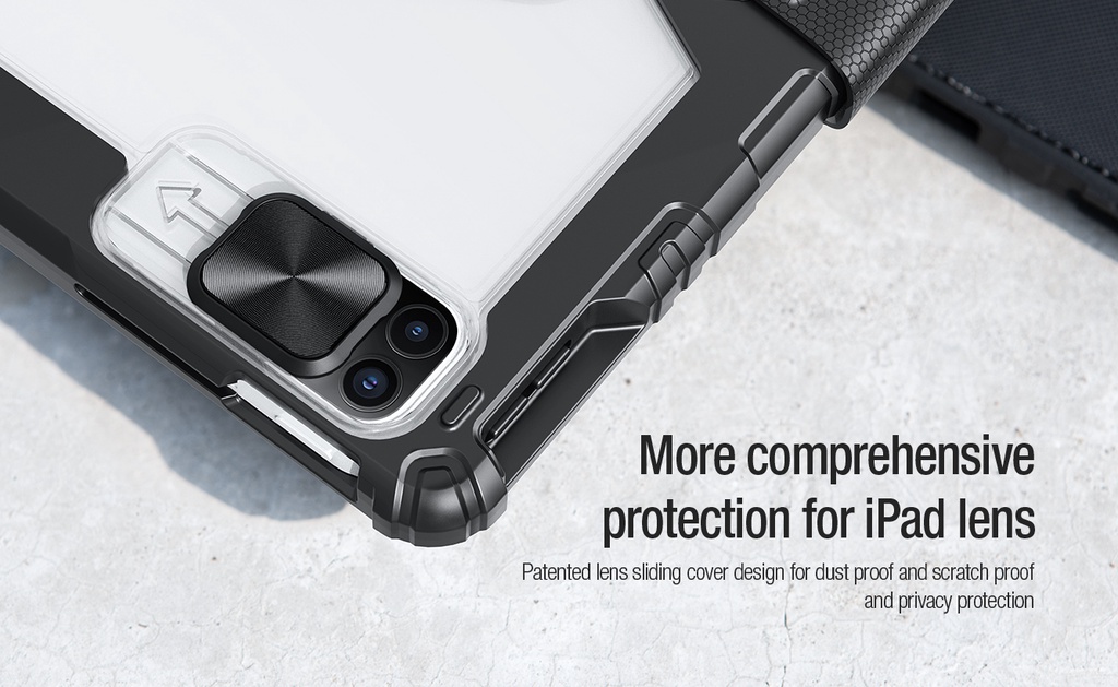 BAO DA IPAD PRO M2 12.9 2022 - M1 12.9 2021 - 12.9 2020 NILLKIN BUMPER SNAPSAFE NAM CHÂM HÍT ĐA NĂNG CHÍNH HÃNG nắp trượt ống kính đã được cấp bằng sáng chế tốt hơn để chống trầy xước và bảo vệ sự riêng tư.