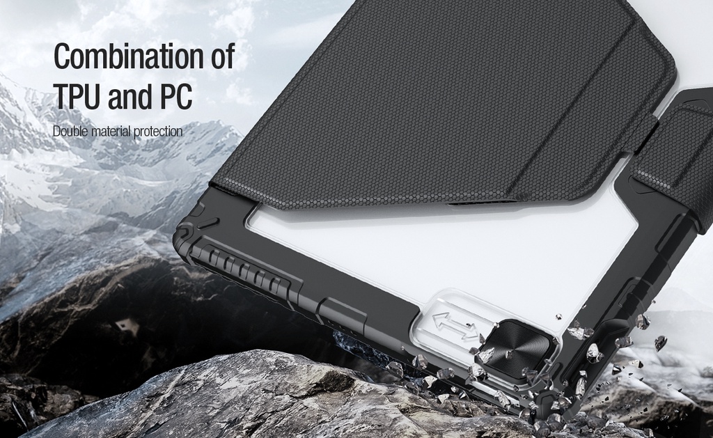 BAO DA IPAD PRO M2 12.9 2022 - M1 12.9 2021 - 12.9 2020 NILLKIN BUMPER SNAPSAFE NAM CHÂM HÍT ĐA NĂNG CHÍNH HÃNG với ốp mặt lưng được làm bằng vật liệu nhựa dẻo TPU phần viền, ôm sát thân máy, dễ dàng tháo lắp không làm trầy xước và phần nhựa cứng PC trong suốt mặt lưng. Nắp lật được làm bằng da PU có đính luôn Logo nhà sản xuất Nillkin, nắp có kết nối nam châm, có tích hợp đóng tắt màn hình khi đóng mở bao da. Mặt lưng bằng nhựa trong suốt khoe toàn bộ lưng máy sang chảnh.