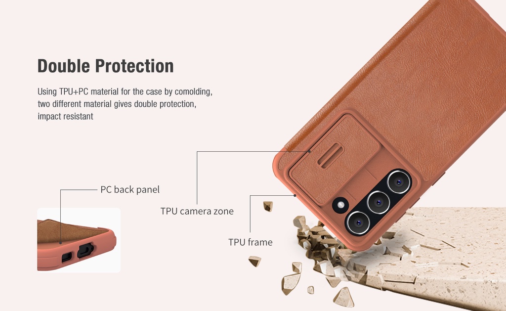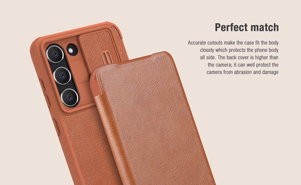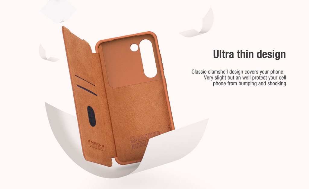 Bao da với khung nhựa được thiết kế tỉ mỉ bo sát thân máy, các phím cứng chức năng được khoét lỗ chính xác, thao tác khi gắn BAO DA SAMSUNG GALAXY S23 PLUS 5G ( S23+ ) NILLKIN QIN PRO BẢO VỆ CAMERA CHÍNH HÃNG vào rất dễ dàng